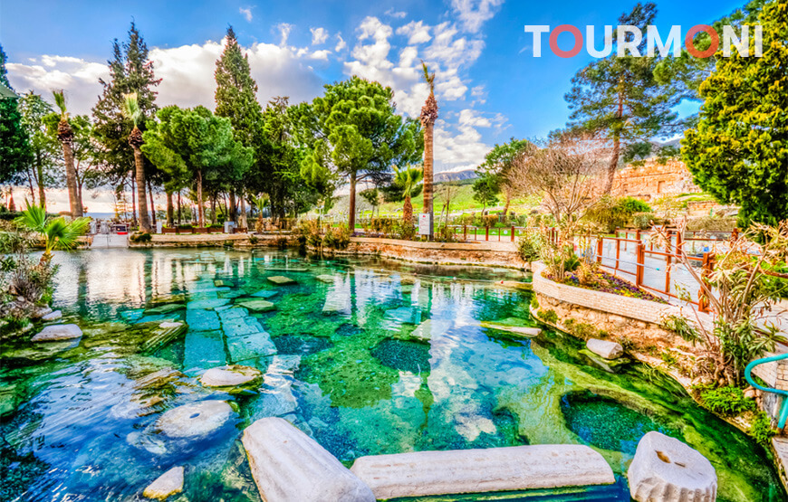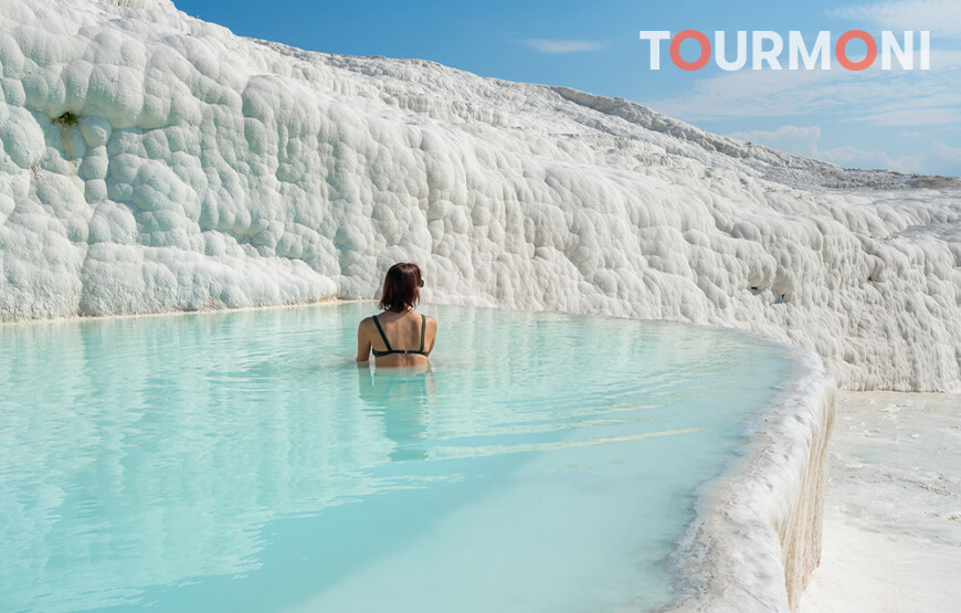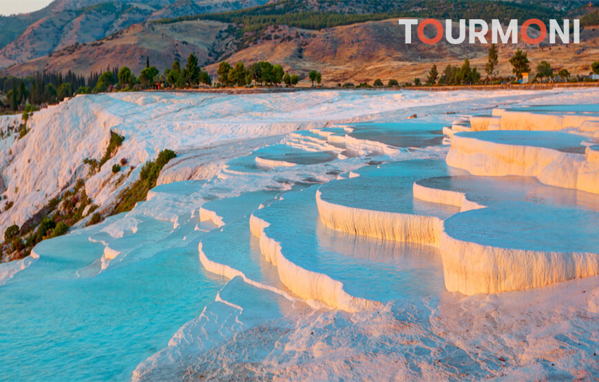 Seuraavaksi sinulla on vapaata aikaa tutkia maailmankuuluja valkoisia terasseja. Paikallisesti Puuvillalinnana tunnettu luonnonihme on syntynyt kalsiumpitoisten termaalivesien virratessa vuorenrinnettä alas, muodostaen lumivalkoisia altaita. Voit kävellä paljain jaloin merkityillä reiteillä, kahlailla lämpimässä vedessä ja ottaa henkeäsalpaavia valokuvia. Aivan travertiinien vieressä sijaitsee kuuluisa Kleopatran allas, jossa legendan mukaan itse Egyptin kuningatar on uinut. Nykyään voit uida kristallinkirkkaassa lämpimässä vedessä, jonka pohjassa lepää aitoja roomalaisia pylväitä (pääsy tähän altaaseen vaatii erillisen lipun).